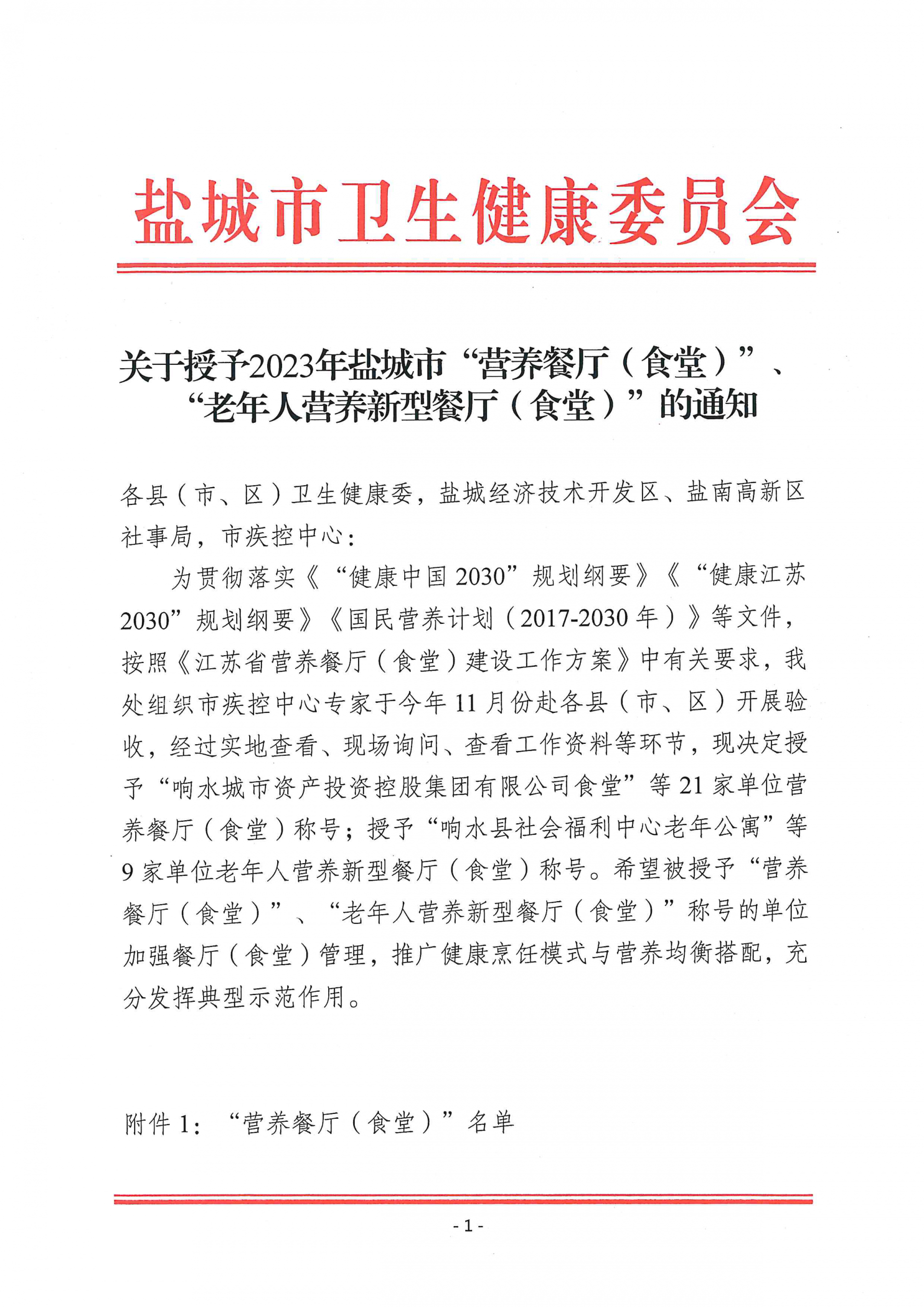 近日,市衛(wèi)生健康委員會印發(fā)《關(guān)于授子2023年鹽城市“營養(yǎng)餐廳(食堂)”“老年人營養(yǎng)新型餐廳(食堂)”的通知》,鹽城市海興集團食堂被授予“營養(yǎng)餐廳(食堂)”榮譽稱號。2023-12-19