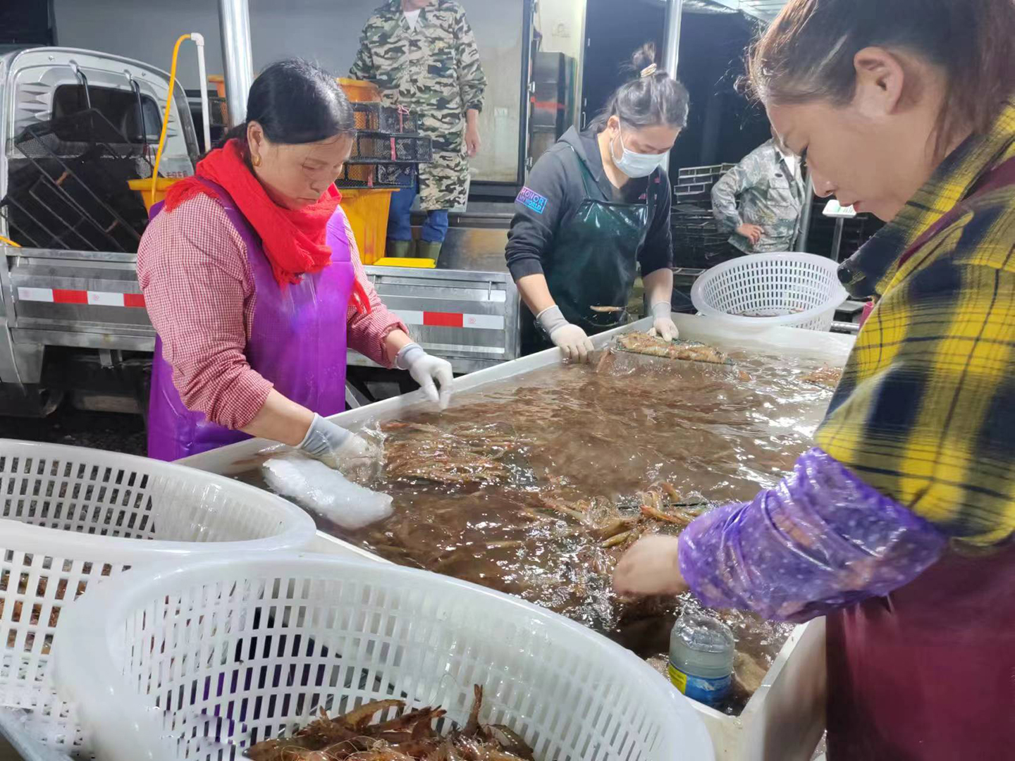 六月的初夏,灌東鹽場迎來了一年中第一波豐收季。在三圩養(yǎng)殖區(qū)的收購現(xiàn)場,忙碌的養(yǎng)殖戶將一筐又一筐的斑節(jié)蝦運送到集中收購點。夜幕下,工人們正熟練的分揀、打包。豐收的斑節(jié)蝦吸引了大批的客商前來收購,一筐筐剛上岸的蝦就被客商搶購一空,被運往全國各地市場進行銷售,2萬多畝的養(yǎng)殖塘口內(nèi)車水馬龍,一派繁忙景象。2023-06-21