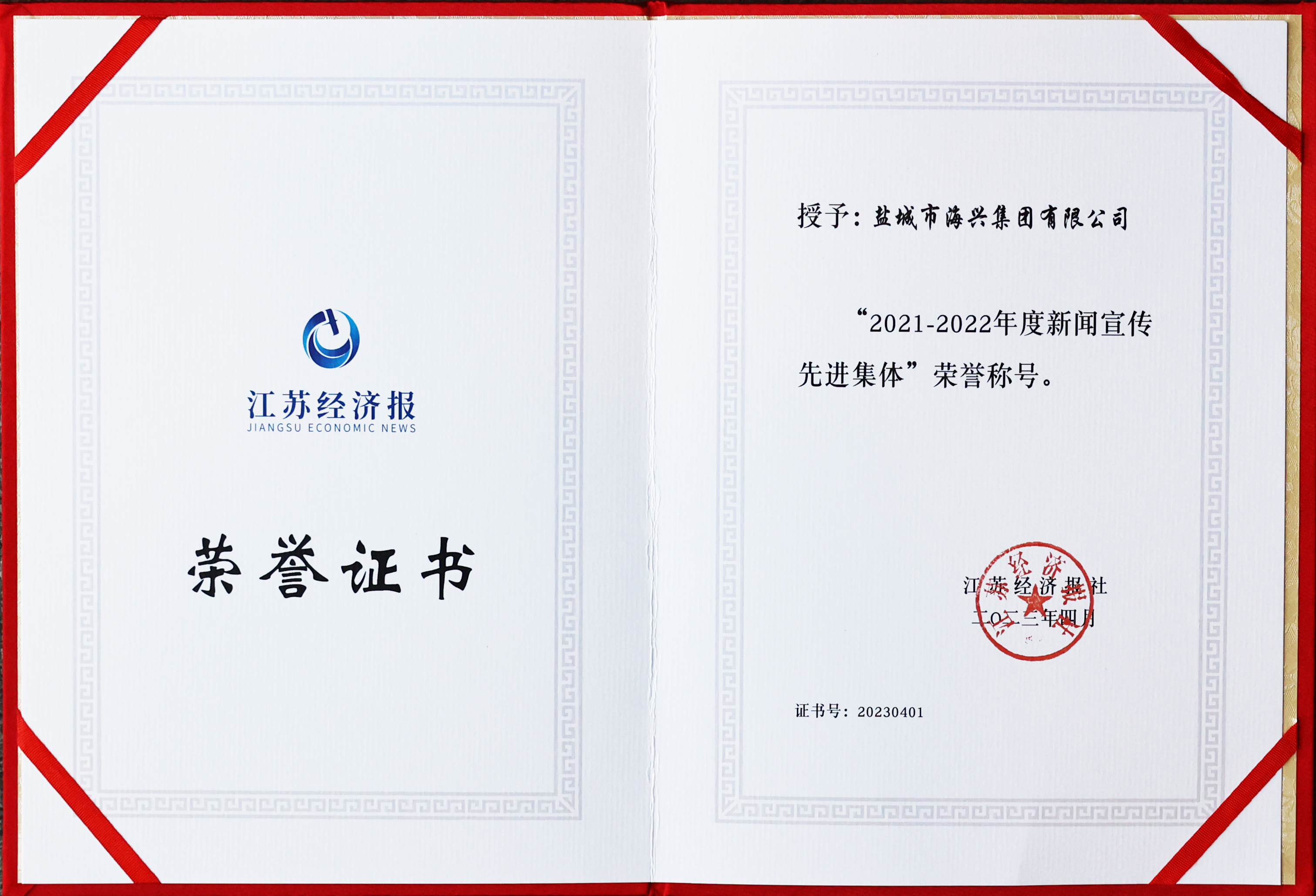 近年來,海興集團緊緊圍繞重點工作做好新聞宣傳,服務發(fā)展大局,傳遞海興聲音,弘揚實干精神,新聞的傳播力、影響力得到顯著提升,全力營造出干事創(chuàng)業(yè)的濃厚輿論氛圍。近日,集團被江蘇經(jīng)濟報授予“2021-2022年度新聞宣傳先進集體”榮譽稱號。2023-04-20
