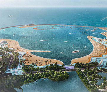 該項目位于月亮灣旅游度假區(qū)海堤外側,以海濱文體旅游綜合體為定位,以2012年四條鯨魚擱淺新灘鹽場附近事件為引,結合古黃河文化和海洋文化,構建以“鯨魚沙灘”為主題的IP。